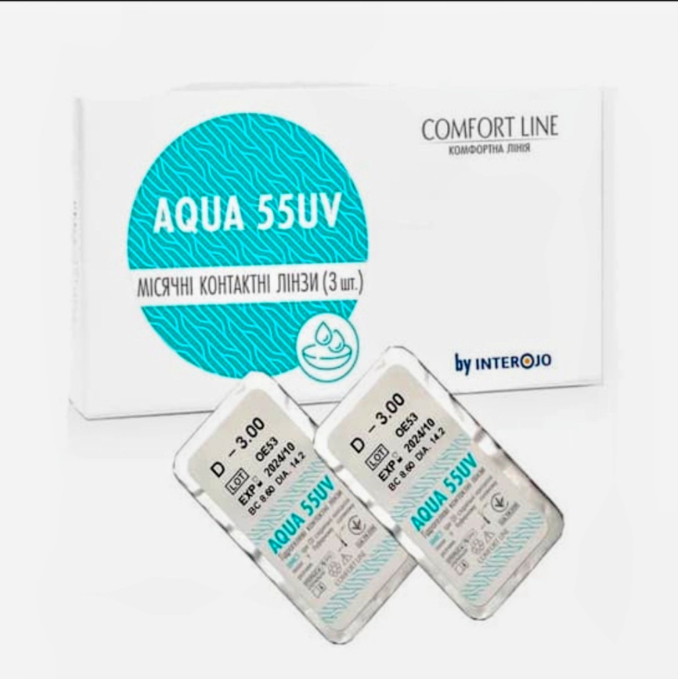 Aqua 55 UV Comfort Line – гідрогелеві контактні лінзи від компанії Interojo, аналог лінз Morning Q55 UV. Період заміни – 1 місяць. Мають високий вміст вологи - 55%, але невисоку кисневу проникність – 24 Dk/t. Тому офтальмологи не рекомендують їх носити довше 8 годин на день.