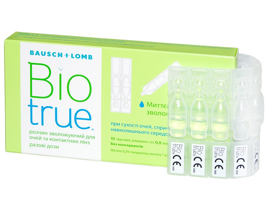 Содержит натуральную полимерную гиалуроновую кислоту (как натрия гиалуронат), которая входит в состав тканей здорового глаза человека и его естественной слезной пленки. Увлажняющий растворBiotrue Drops - инновационная многократная система без консервантов, естественным путем успокаивает сухие глаза и уменьшает такие симптомы, как усталость, раздражение и слезоточивость.