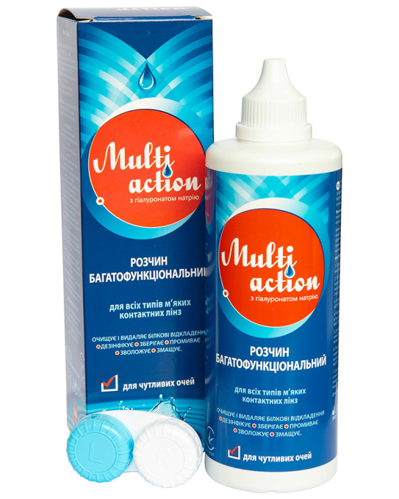 Multi Action - універсальний розчин для контактних лінз, призначений для: