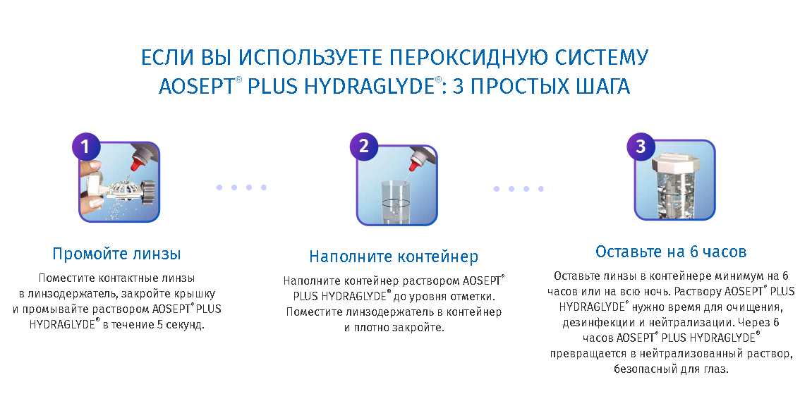 Пероксидна система Aosept Plus HydraGlyde ідеально підходить для всіх сучасних типів контактних лінз, у тому числі силікон-гідрогелевих.