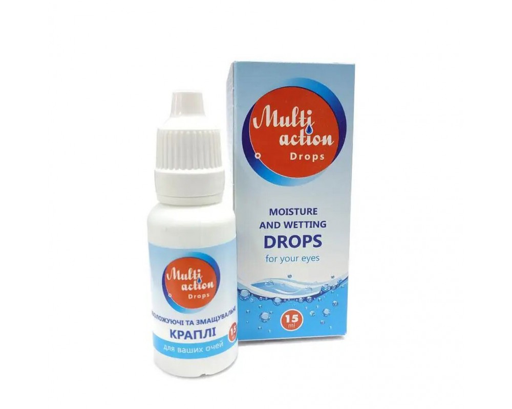 Краплі MULTI ACTION Drops містять природній зволожуючий компонент — гіалуронову кислоту, що має властивість зв'язувати воду у великій кількості та чудово зволожувати око, що дає стабільність слізної плівки та вміст вологи рогівкою, а також зменшення слізного випаровування.